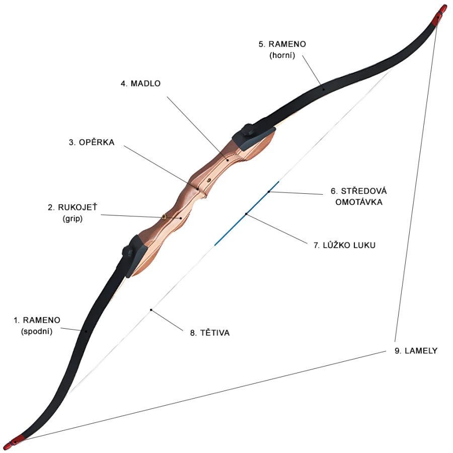 Před montáží si připomeň, jak se jednotlivé části skládacího luku nazývají. Napoví ti schéma níže.