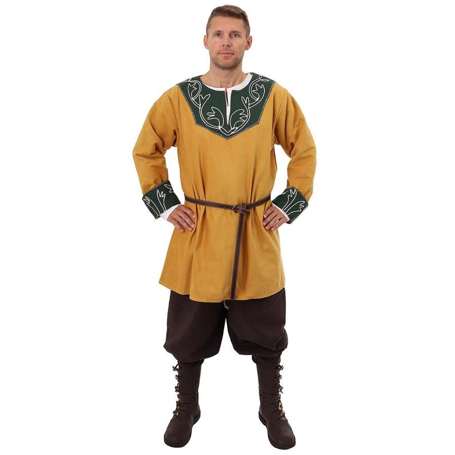 Muž si natáhl kalhoty, které stáhl v pase šňůrkou. Potom si oblékl košili a tuniku sahající do půli stehen. Přes ni si zapnul široký kožený opasek s kovovou přezkou, k němuž byla připevněna pochva s dýkou.