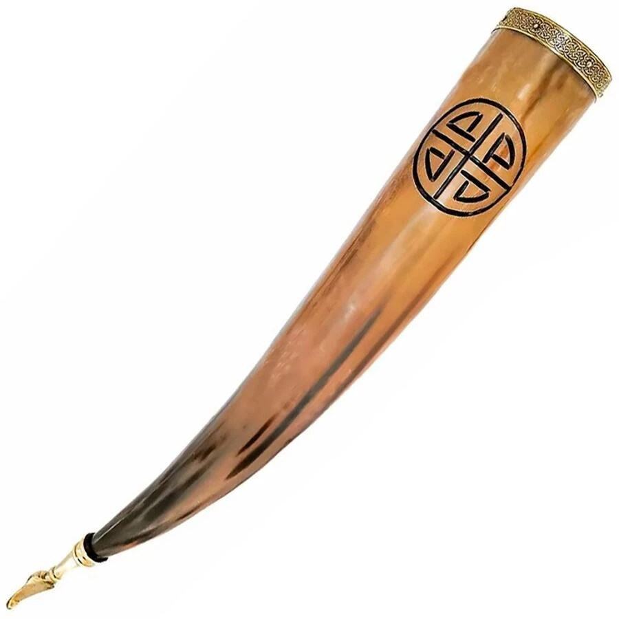 Roh na pití s kovovou špičkou a rytým vikinským/keltským ornamentem