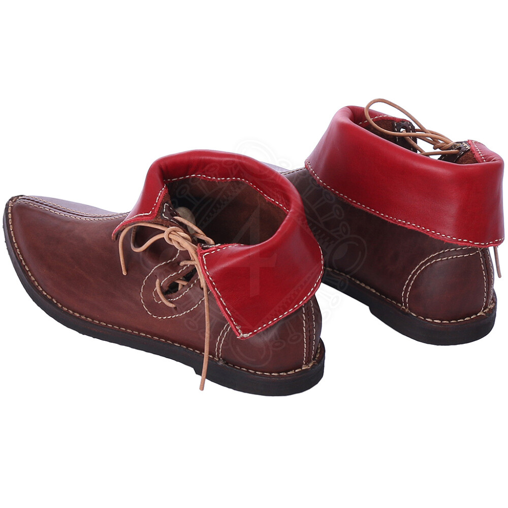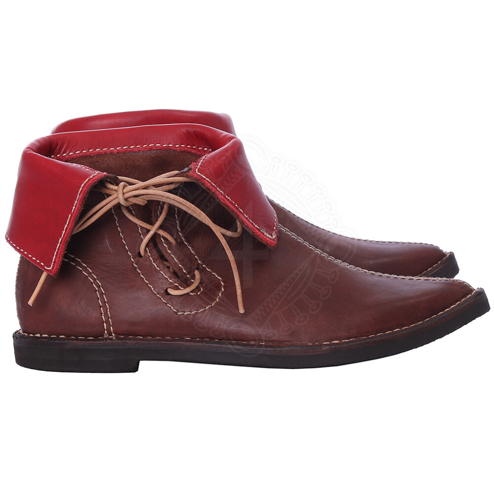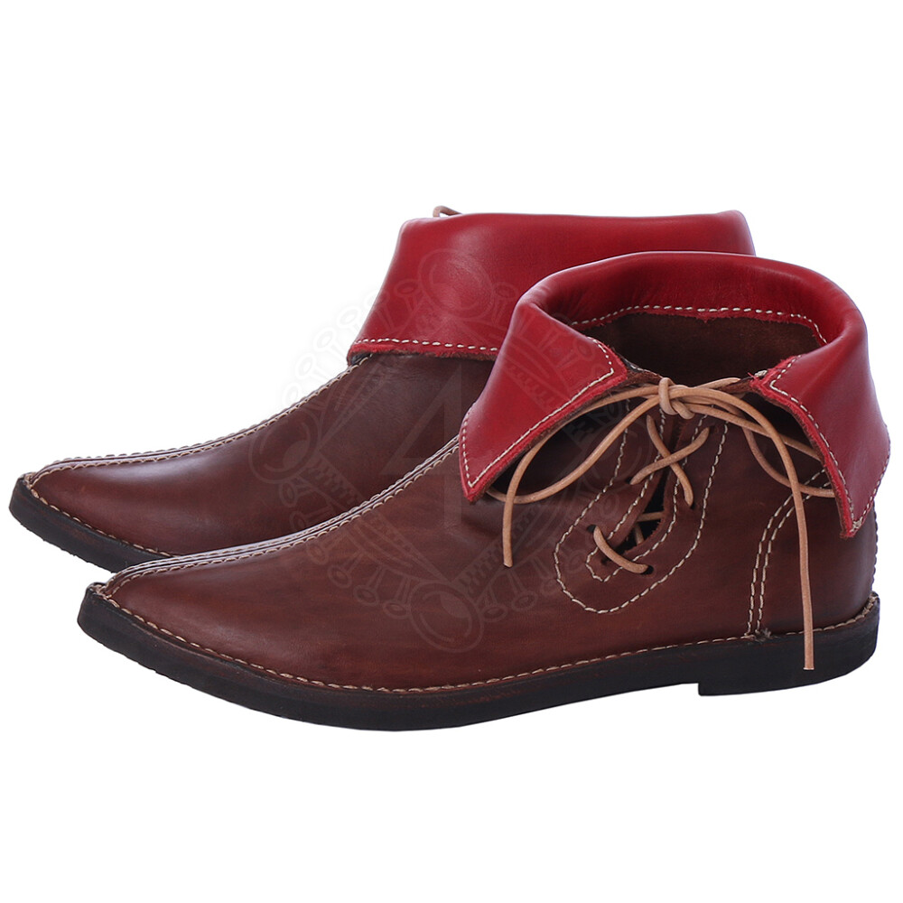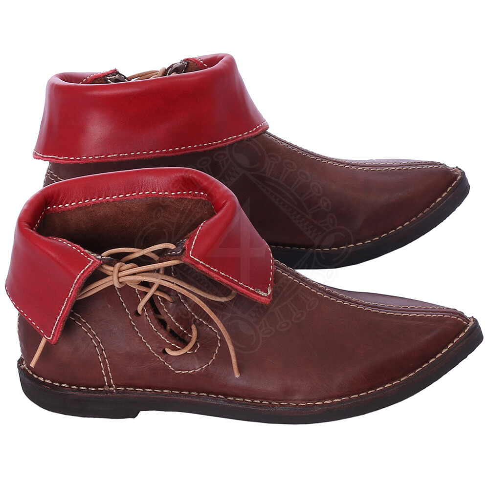 Středověké špičaté škorně s červenou vnitřní stranou manžet