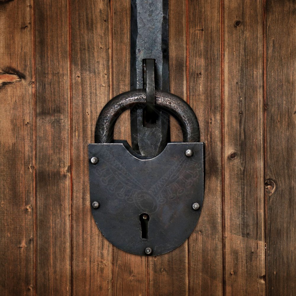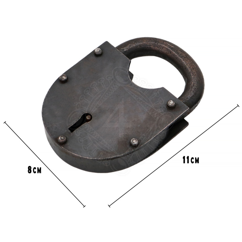Tento visací zámek je ručně vyroben z konstrukční oceli, ale díky povrchové úpravě kovářským černěním působí dojmem starého, věky používaného železa. Jeho surový, nýtovaný vzhled se skvěle hodí pro období středověku, ale neurazí ani ve fantasy settingu.