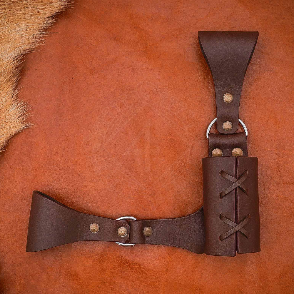 Tvůj meč je tvůj nejvěrnější společník, tak proč mu nedopřát závěsník, který je ho hoden? Tento středověký závěsník na meč je ručně vyroben z poctivé a silné bůvolí kůže, která nejenže vydrží nástrahy bitev a dobrodružství, ale časem získá i jedinečnou patinu. Díky chytrému designu se šněrováním a nastavitelným popruhem se přizpůsobí většině pochev a umožní ti nosit meč bezpečně a pohodlně. Stylové nýty z patinované mosazi dodávají celku na autentičnosti. Tento závěsník je k dispozici v hnědé i černé barvě a ve variantách pro praváky i leváky, takže si zaručeně vybereš ten pravý pro svůj kostým rytíře, žoldnéře nebo tuláka. Více informací k produktu ...