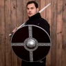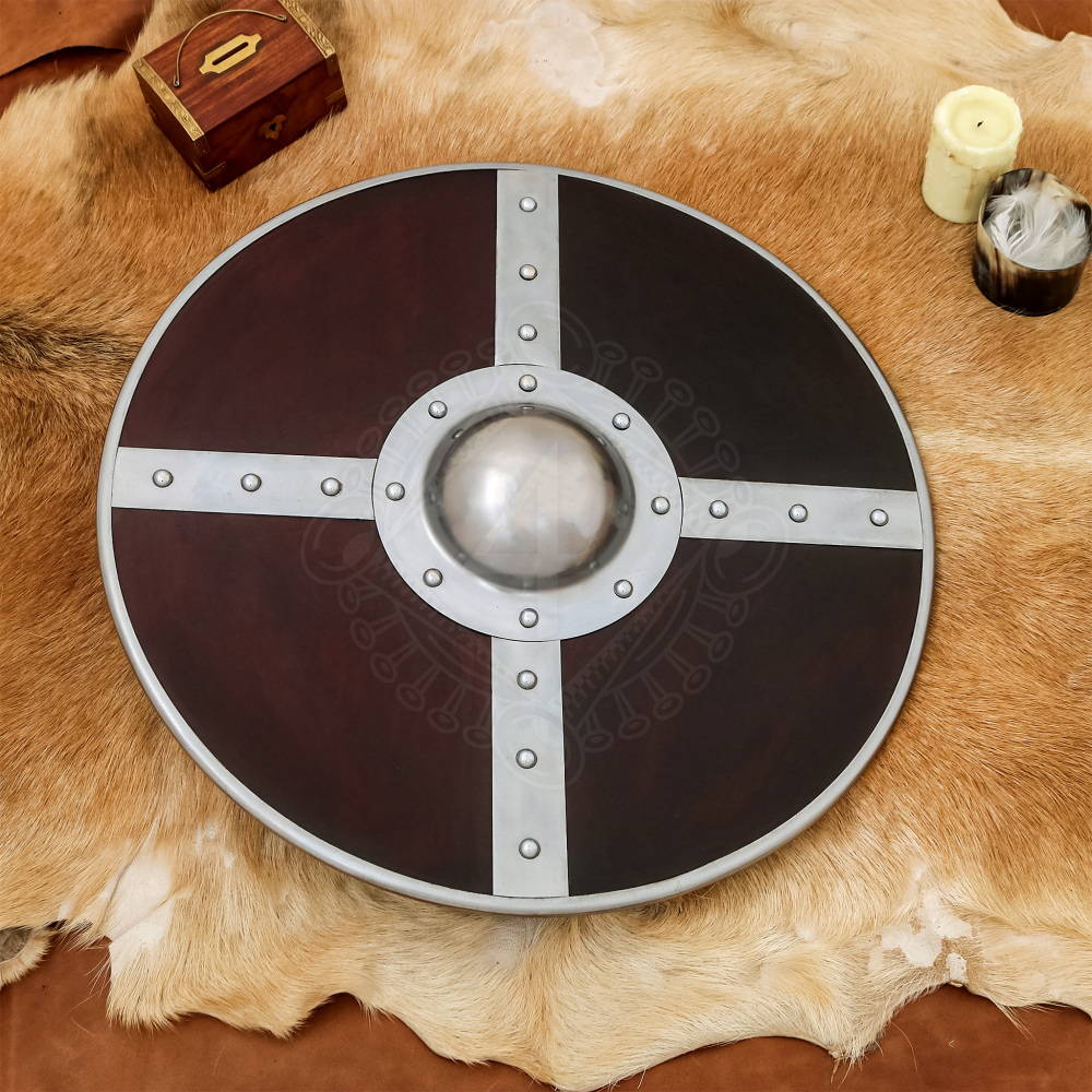 Tento štít podle předlohy raného středověku je vyroben ze dřeva. Na jeho základovou desku je nanýtované středové umbo a jeho okraj je kompletně okovaný zaoblenou obručí - hrana štítu je zabalena do železa. Zadní část štítu je černě natřená. Více informací k produktu ...