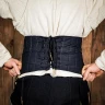 - Systém šněrování: Pás se vpředu stahuje pevnou bavlněnou tkanicí s mosaznými nákončími (aiglety), které usnadňují provlékání. Celkem 12 dalších otvorů na kožených panelech slouží k provlečení tkanic pro připevnění tvé zbroje.