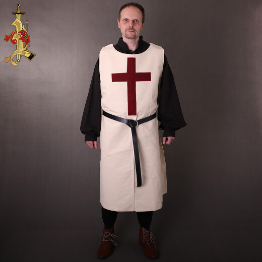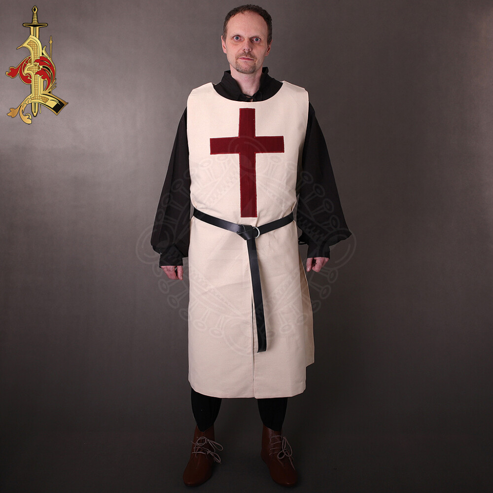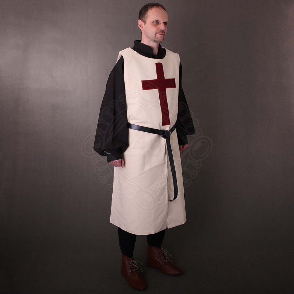 Varkoč je zhotoven z pevné, krémově bílé 100% bavlny o gramáži 220 g/m². Materiál je na dotek příjemný, ale zároveň dostatečně odolný, aby vydržel i náročné podmínky. Dominantou varkoče je velký, vínově červený latinský kříž, který je precizně aplikován na hrudi. Tento symbol okamžitě evokuje dobu křížových výprav a dodává varkoči autentický vzhled.