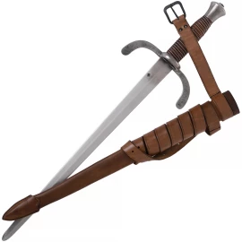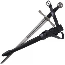 Meč je dodáván s **dřevěnou pochvou** potaženou černou kůží. Pochva je vybavena funkčním obústkem a nákončím z železného plechu, které chrání špičku i ústí a dodávají celku elegantní vzhled.
