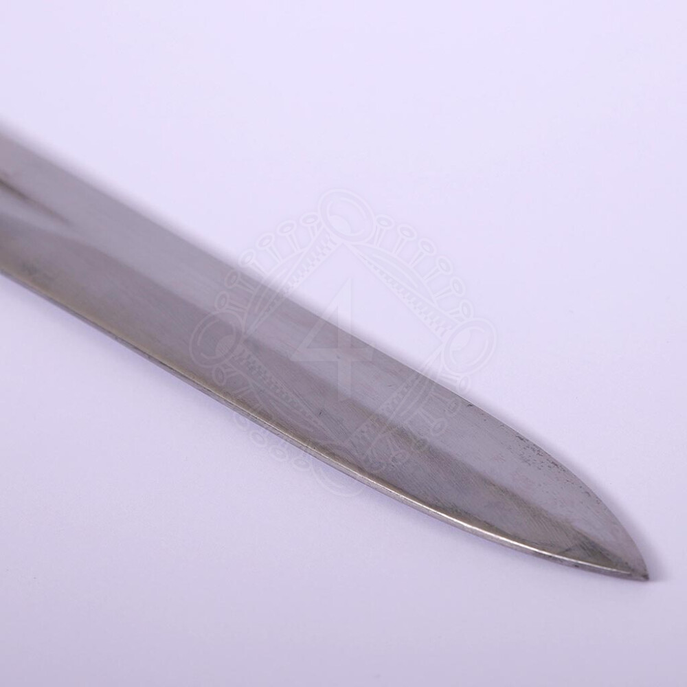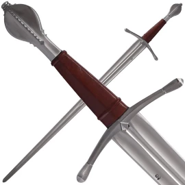 Jednoduchá, ale elegantní záštita a kotoučová hlavice jsou vyrobeny z **nekaleného železa**. Rukojeť se skládá z řapu čepele obloženého dřevem a je potažena **černou kůží**, což zajišťuje pevný a pohodlný úchop. Celá konstrukce je robustně spojena průchozí stopkou čepele, která je roznýtovaná za hlavicí, čímž je zaručena pevnost a dlouhá životnost.