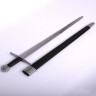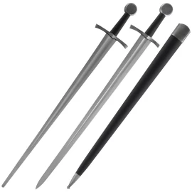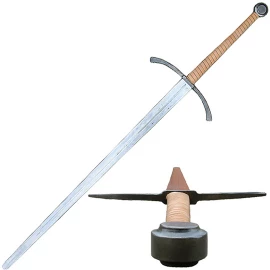Tento **rytířský meč** je navržen s ohledem na historickou autenticitu. Jeho dlouhá, rovná a oboustranná čepel je vyrobena z **vysokouhlíkové oceli** a je po obou stranách opatřena tradičním centrálním žlábkem (žlábek na čepeli je dlouhý cca 63,5 cm), který snižuje hmotnost a zlepšuje vyvážení zbraně. Čepel se směrem ke špičce zužuje, ale zůstává dostatečně robustní. Díky zaoblené hraně o tloušťce cca 2,3 mm je meč bezpečný pro použití v lehkém kontaktním šermu.
