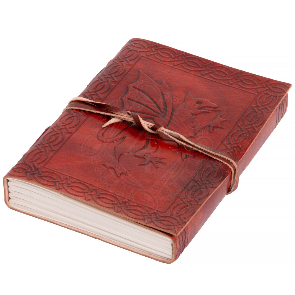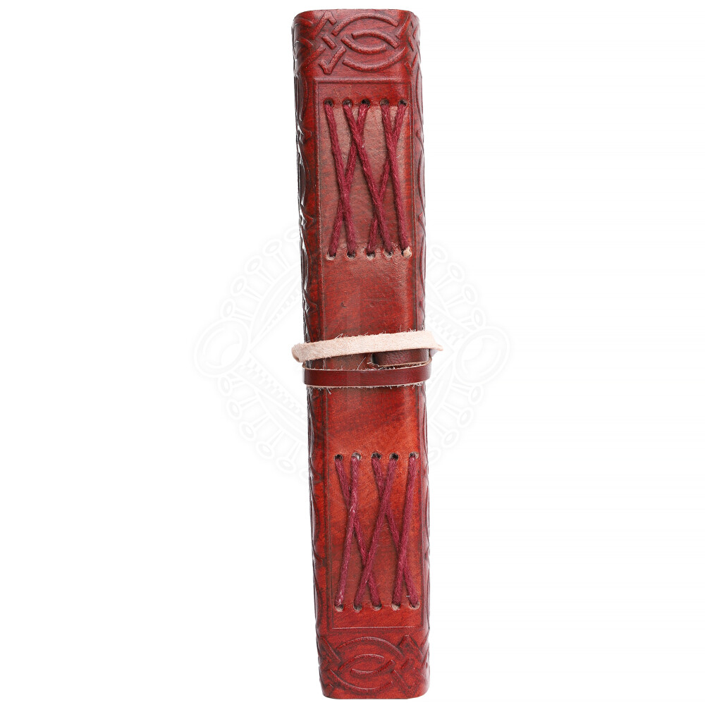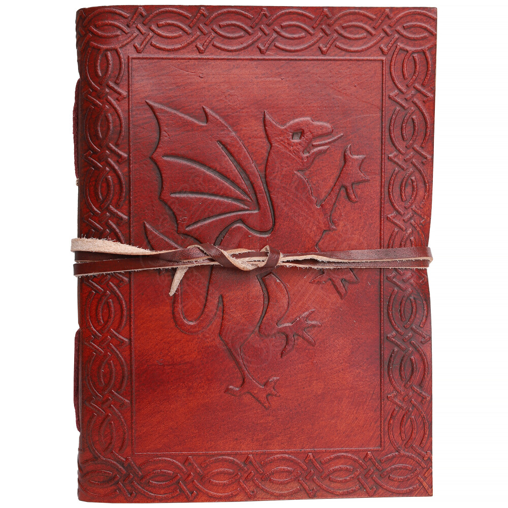 Deník je vyroben z kvalitní, pevné buvolí kůže v červenohnědém odstínu. Dominantou přední desky je reliéfní ražba draka (v heraldice často zobrazeného jako vyvern), který symbolizuje sílu, moudrost a ochranu. Okraje desek jsou lemovány propracovaným vzorem keltských uzlů, jež reprezentují nekonečnost a propojení všech věcí. Hřbet knihy zdobí křížové prošívání kůží, které nejen skvěle vypadá, ale také zpevňuje vazbu.