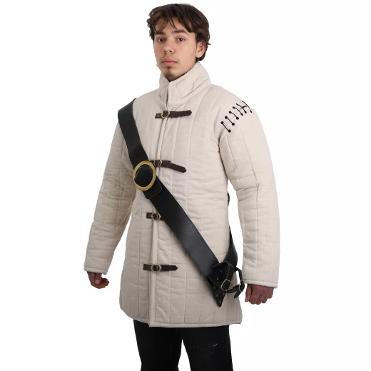 1xNoste svůj meč, sekeru či palcát pohodlně a stylově díky tomuto robustnímu koženému bandalíru. Nejde jen o praktický doplněk, ale o výrazný prvek, který dotvoří tvůj kostým a podtrhne charakter tvé postavy. Je vyroben z poctivé, silné kůže v černé barvě a zdoben masivní kruhovou přezkou z mosazi. Díky speciálně rozšířené ramenní části se váha zbraně pohodlně rozloží a nebude tě tlačit ani při celodenním nošení. Tento závěs je navržen pro praváky, tedy pro nošení na levém rameni se zbraní u pravého boku. Více informací k produktu ...