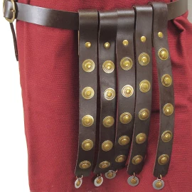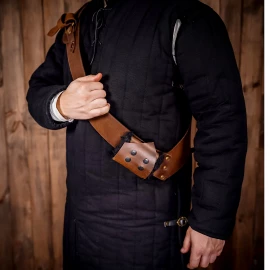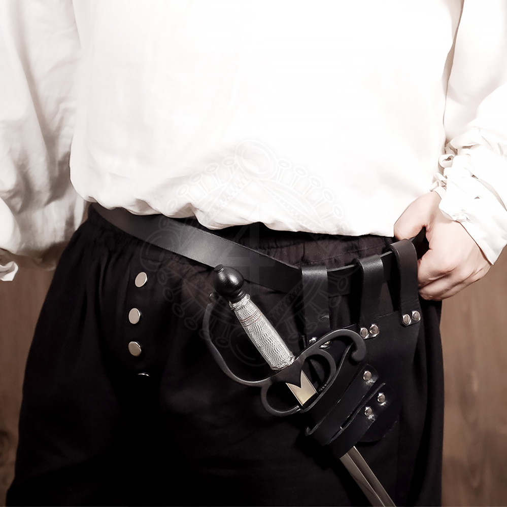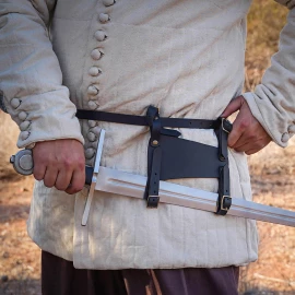 Zajisti své elegantní zbrani, jako je rapír nebo kord, místo, které jí náleží. Tento kožený opaskový závěs, inspirovaný historickými vzory, je navržen pro bezpečné a pohodlné nošení tvé zbraně. Díky tradiční konstrukci se třemi poutky na opasek a třemi šikmými poutky na pochvu bude tvůj rapír viset ve správném úhlu, připravený k tasení. Je vyroben z poctivé buvolí kůže a představuje ideální doplněk pro kostýmy mušketýrů, renesanční šlechtice a pro všechny šermíře na LARPových akcích. Více informací k produktu ...