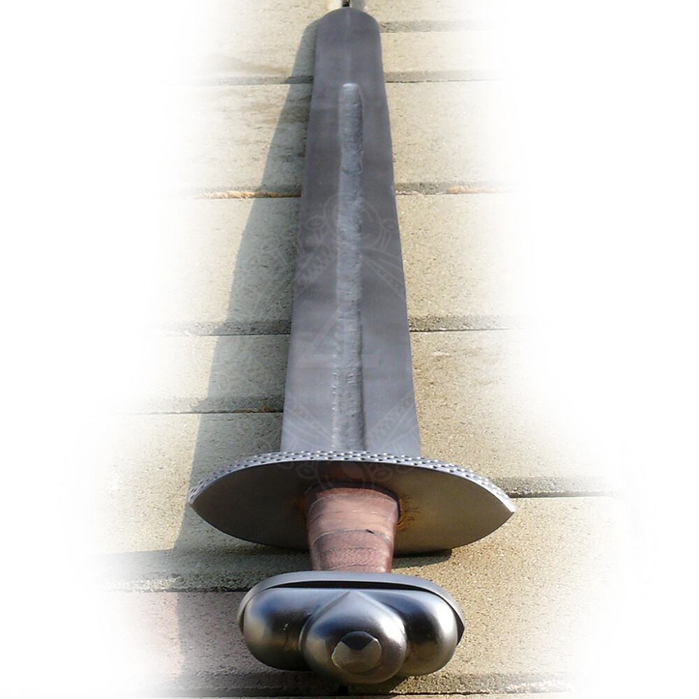 Ich habe das Schwert in "Vollausstattung", also poliert und geschmiedet in Schaukampfversion, also stumpf, geschenkt bekommen. Das Schwert ist mit 78cm Klingenlänge sowie 1,7kg Gewicht deutlich länger und auch schwerer wie viele der üblichen Wikischwerter. Das macht es eher zu einem Schwert für einigermaßen fortgeschrittene Schaukämpfer. Aber durch die Länge hat man im Buhurt natürlich, wenn man sich an die die Handhabung gewöhnt hat, einen nicht zu verachtenden Reichweitenvorteil. Der Griff ist breit genug um das Schwert auch mit einem dicken Schutzhandschuh sicher führen zu können. Auch hier ein deutlicher Vorteil, da manchmal die Grifflänge den Schutzhandschuh nicht ausreichend mit einrechnet.