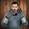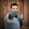 - Konstrukce: Kroužkové pletivo (vnitřní průměr kroužků cca 6,4 mm, síla drátu cca 1,2 mm) je pečlivě našito na semišovou rukavici. Ocelové pláty jsou pevně přichyceny k rozšířené kožené manžetě.