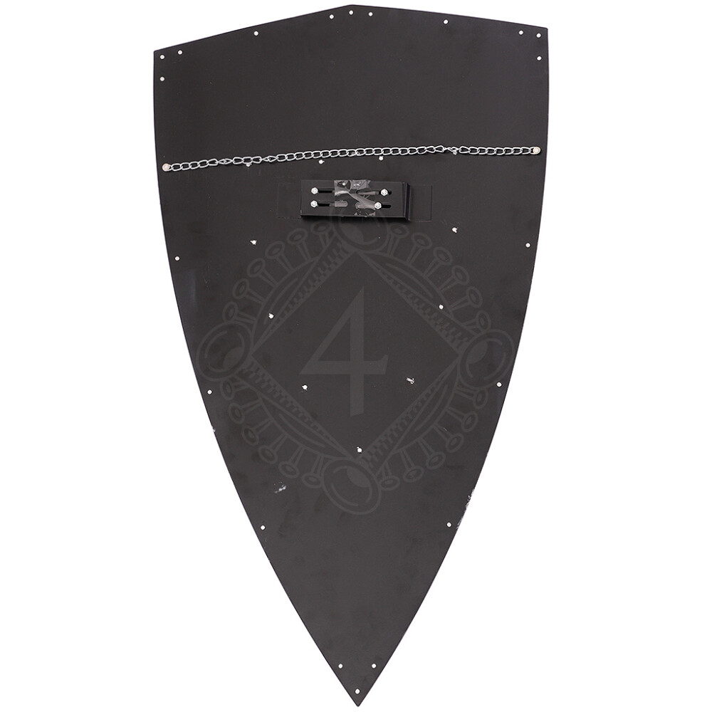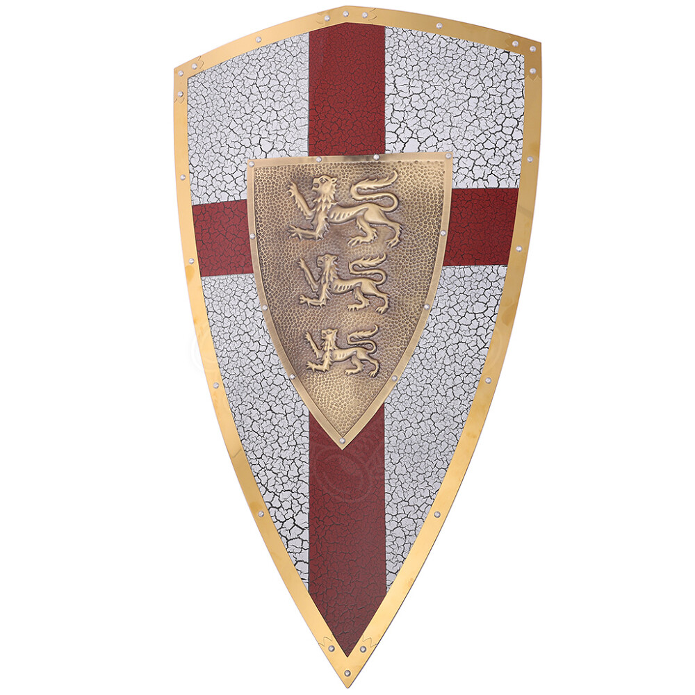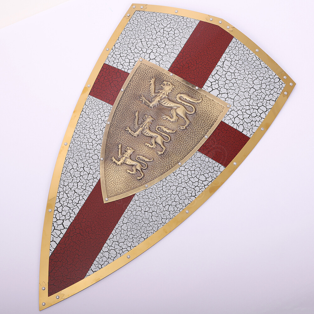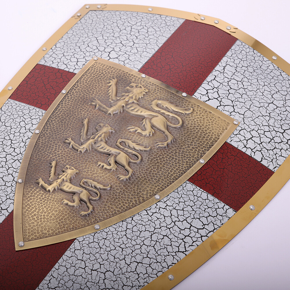 Kovový štít zdobí středová mosazná aplikace s reliéfem tří heraldických lvů.