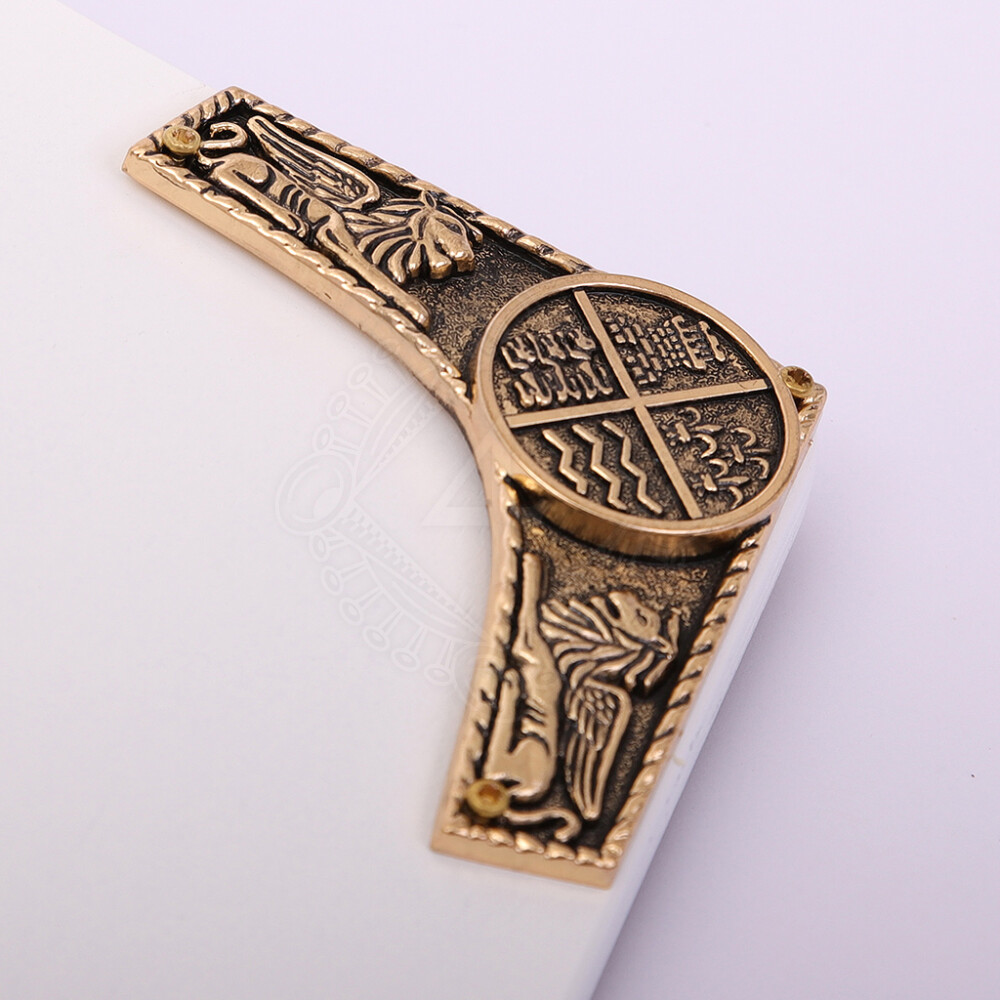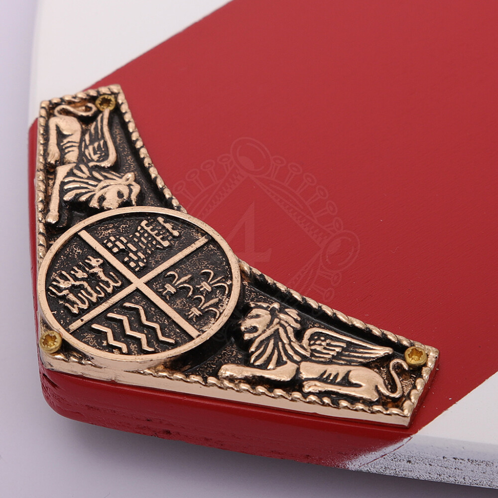 Mosazné kování a patinované mosazné emblémy na přední straně: Francouzské lilie zv. fleur-de-lis, červený křižácký kříž a lev hlavy.
