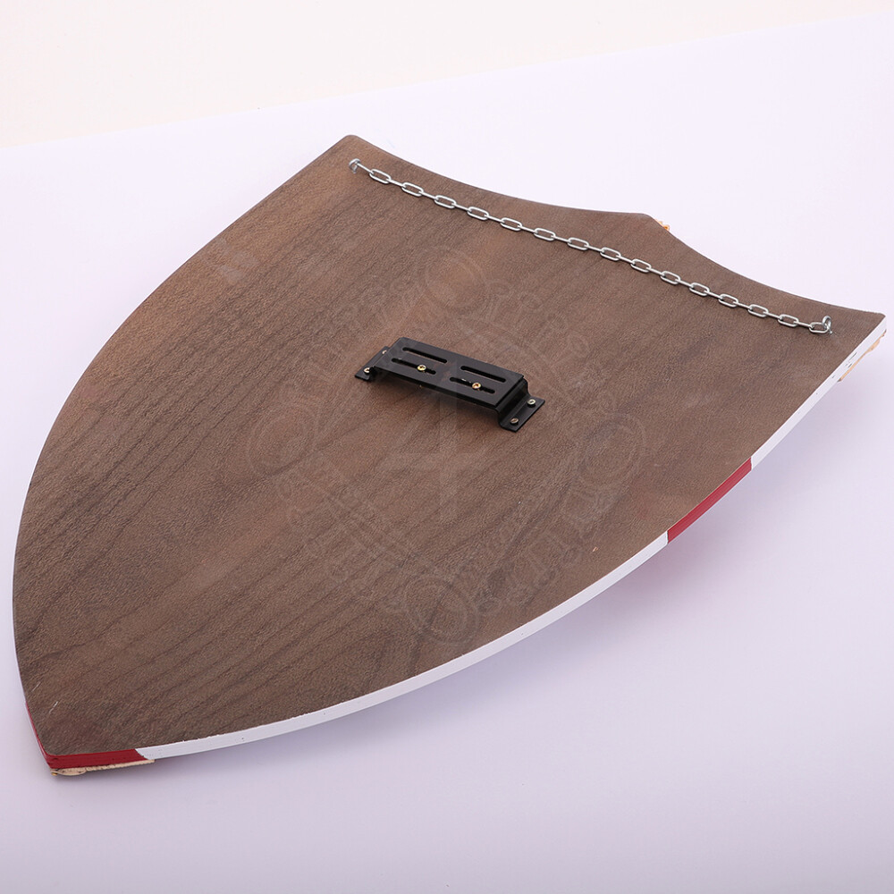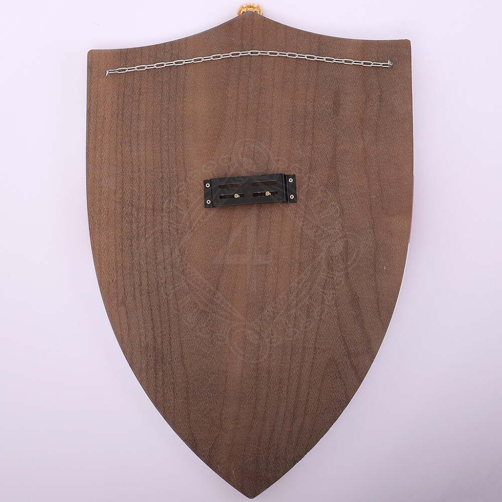 Tento dekorativní štít je na zadní straně opatřen řetězem k zavěšení na stěnu.