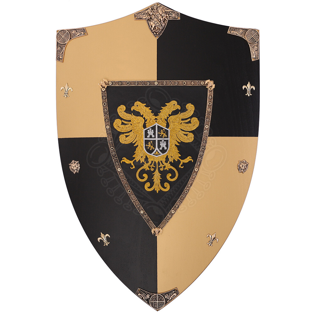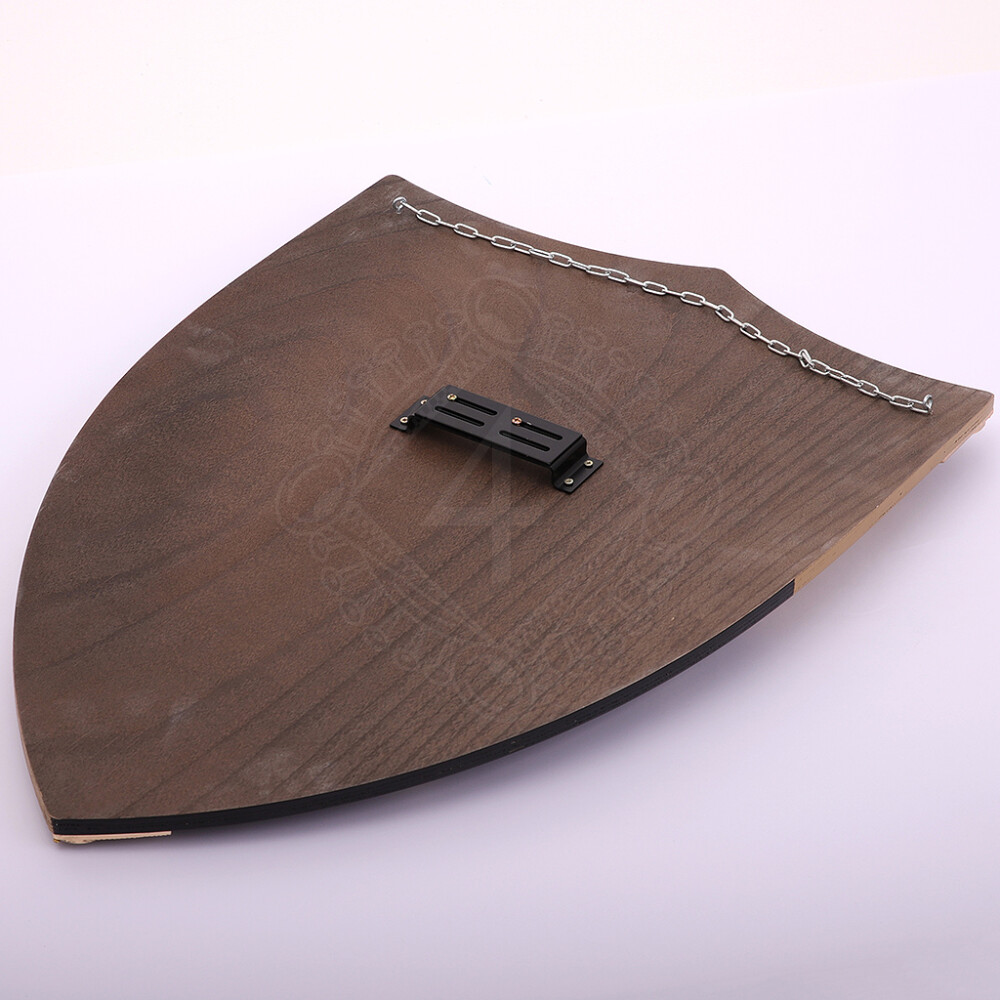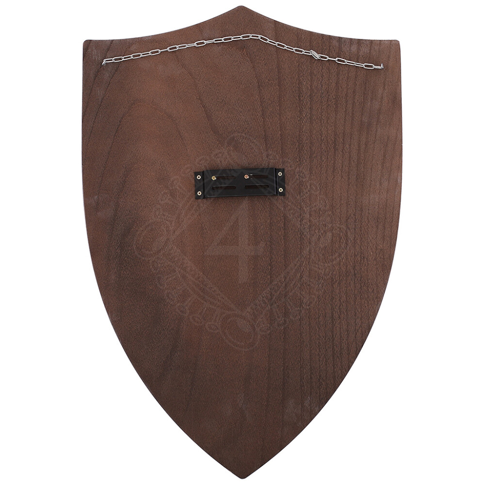 Tento dekorativní štít je na zadní straně opatřen řetězem k zavěšení na stěnu.