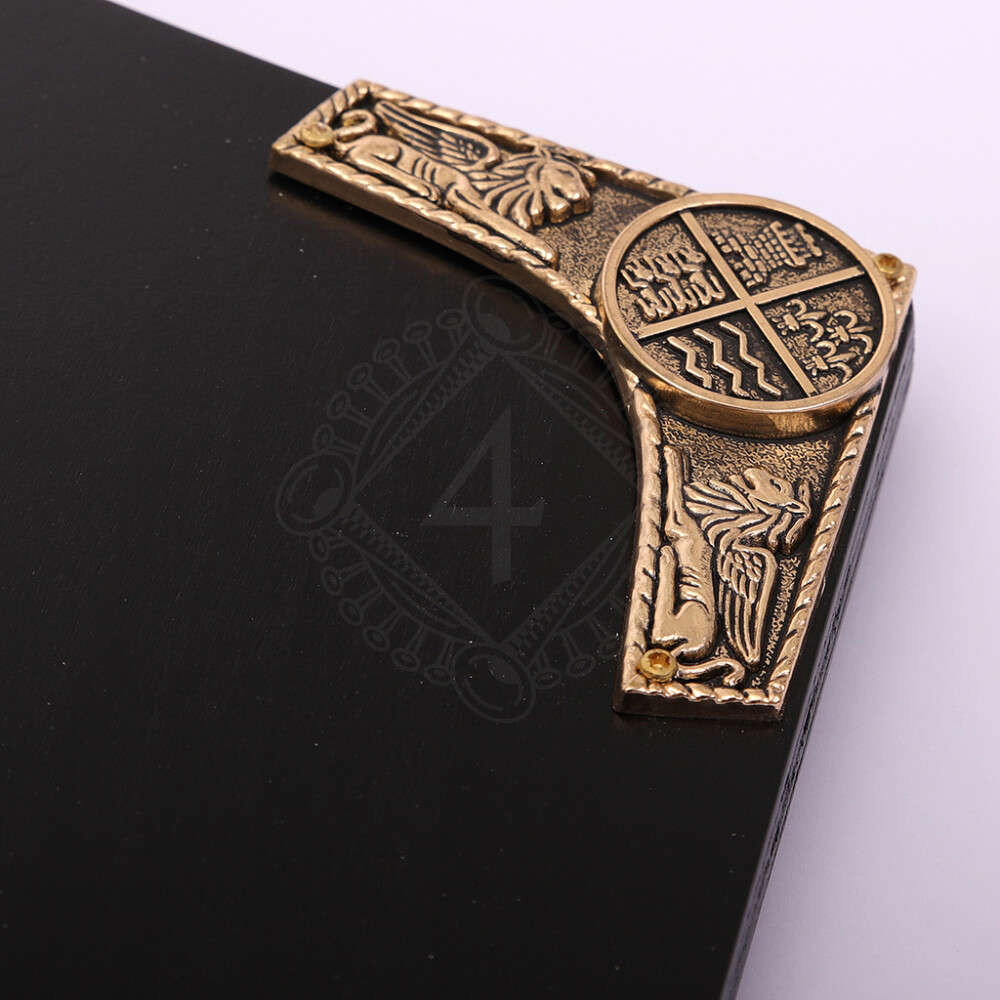 Mosazné kování a patinované mosazné emblémy na přední straně: Francouzské lilie zv. fleur-de-lis, lev hlavy, motivy se vztahem k Toledu a dvouhlavý orel.