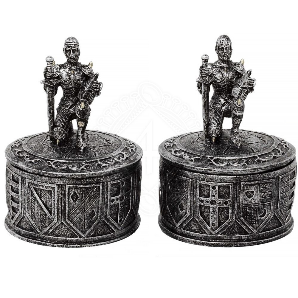 Každá schránka / truhlička je zdobená motivy historických erbovních štítů. Na víčko každé ze schránek je plastika rytíře v pokleku držícího meč a svou helmu v podpaží. Truhlička s rytířem je ručně malovaná. Více informací k produktu ...