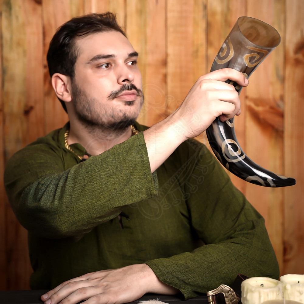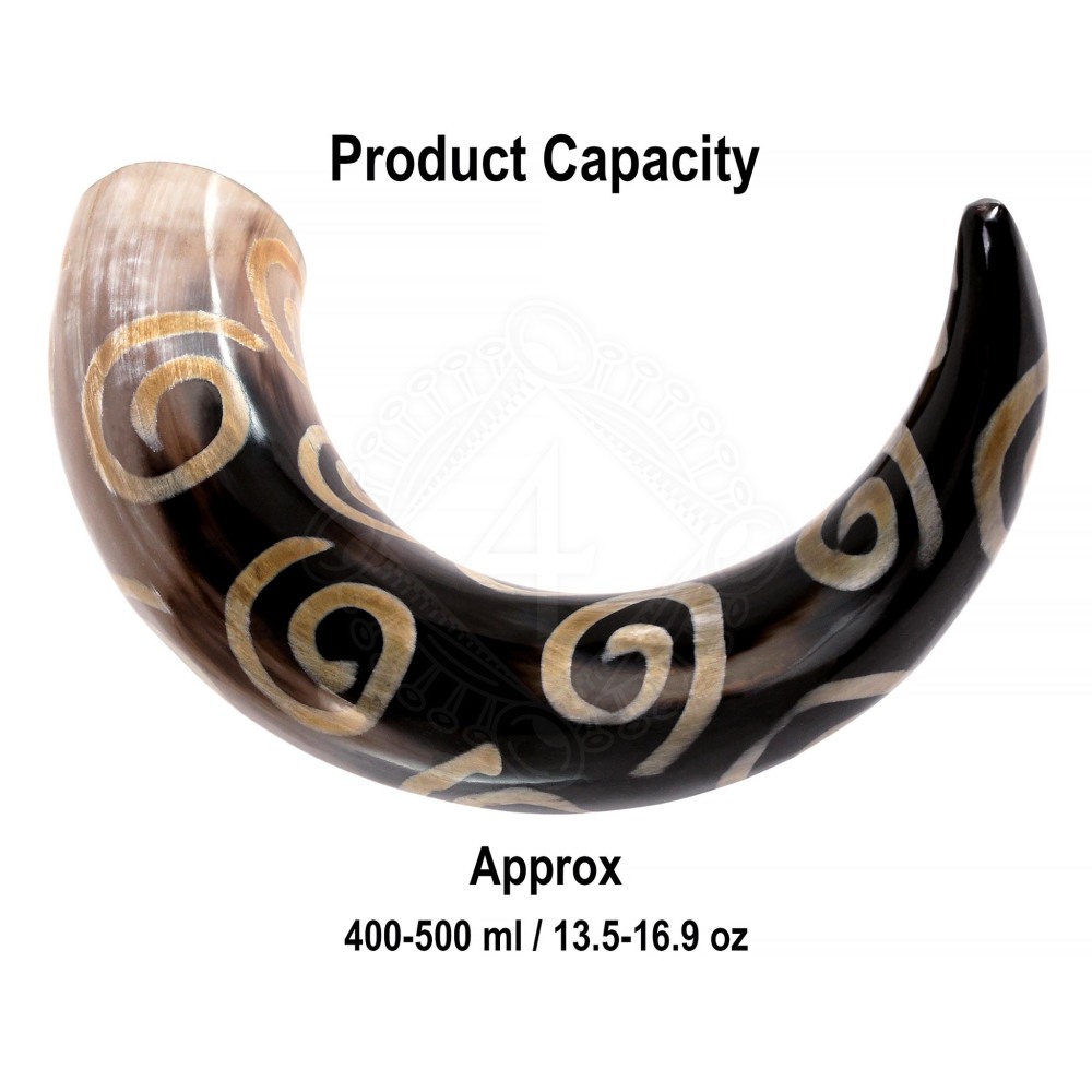 Tento picí roh je vyroben ze 100% přírodní, eticky získané pravé rohoviny. Každý kus je naprostý originál, protože přírodní zbarvení, tvar a textura rohu jsou vždy jedinečné. Umělecký dojem umocňují precizně vypálené nebo vyryté spirálové vzory, které z každého rohu dělají skutečné umělecké dílo. Vnitřek je pečlivě ošetřen certifikovanou potravinářskou pryskyřicí, která zajišťuje jeho nepropustnost a funkčnost.