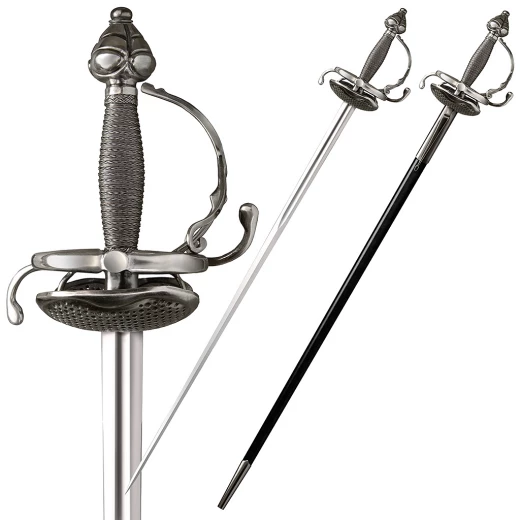 Cavalier Rapír je propracovaná replika lehkého meče z poloviny 17. stol. Na této zbrani je kladen důraz na detail. Rapír italské šlechty (Cavalier Rapier) je nádherně provedená replika lehkého meče z poloviny 17. stol. Má dlouhou úzkou a profilovanou čepel s brusem po obou stranách. Rukojeť je zdobně vypletena drátem a ochráněna nádherným košem. Jílci dominuje velká hlavice vejcovitého tvaru. Ruku chrání velká tvarovaná záštita. Pochva meče je vyrobena z černé kůže s kovovým límečkem. Více informací k produktu ...