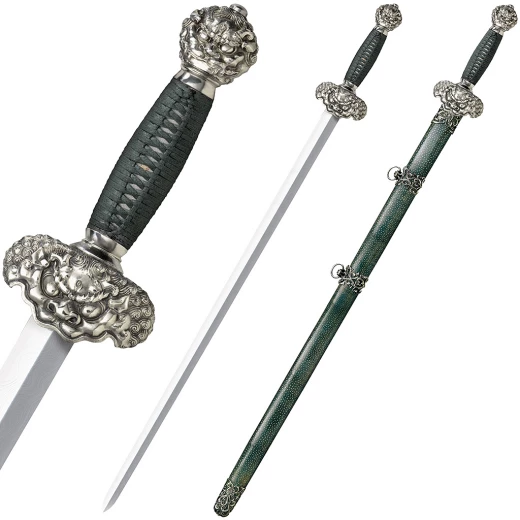 Série Cold Steels® Jade Lion je velmi oblíbená u sběratelů i fanoušků čínských bojových umění. Čepele v této kolekci jsou ručně kované z vysoce kvalitní damaškové oceli a odborně kalené a svým propracovaným vzorem jsou nejen ostré, ale také krásné. Záštita a hlavice jsou odlity z niklového stříbra a zdobeny čínským motivem ostražitého lva. Nabízejí ostrý barevný kontrast k elegantní zelené šňůře (Jade), jíž je ovinuta rukojeť. Pochva je zhotovena z růžového dřeva, potaženého rejnočí kůží (Samé) obarvené Jade zeleným pigmentem.