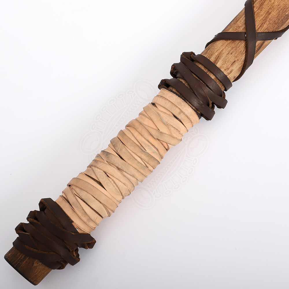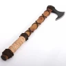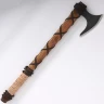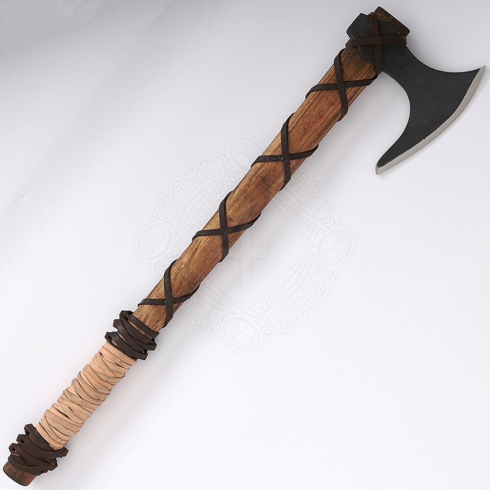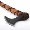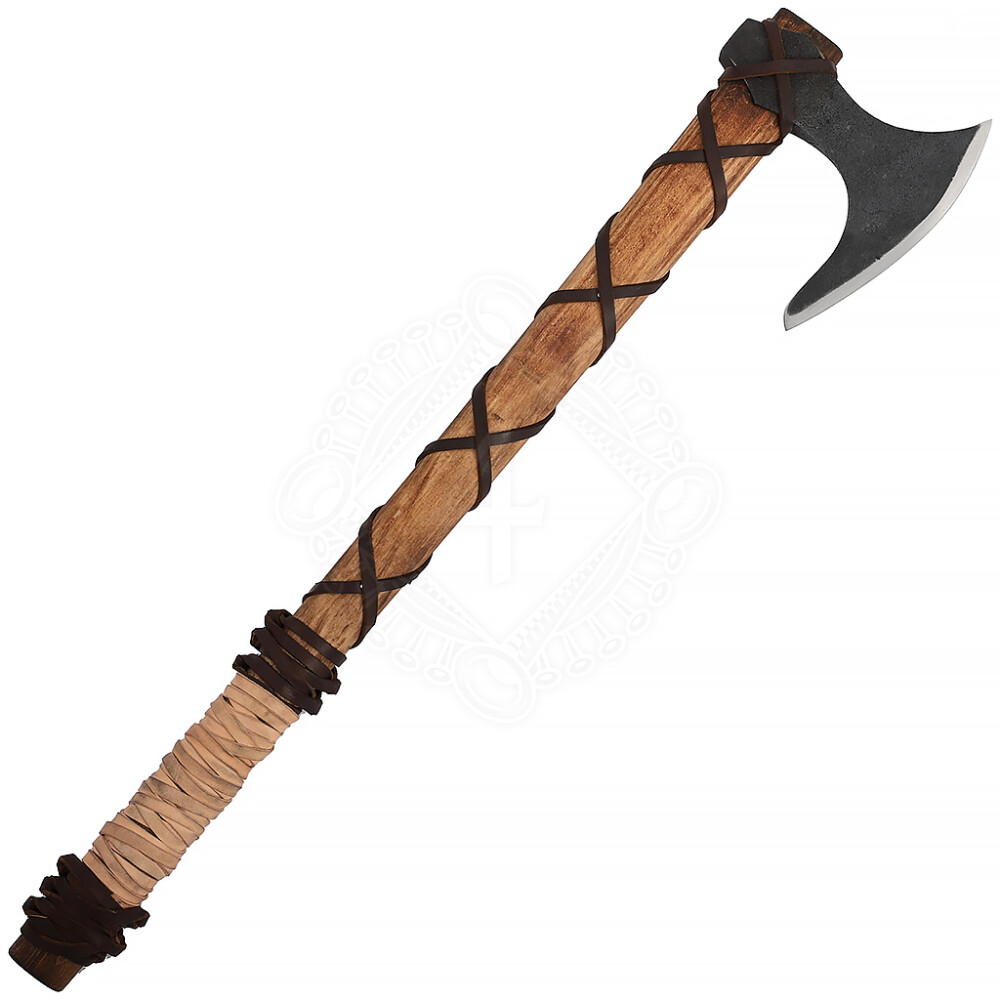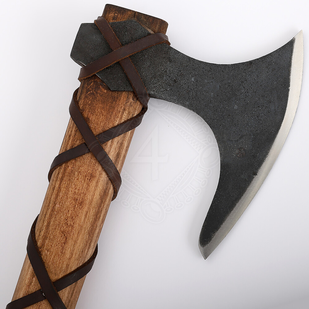Bojová sekera vikingských válečníků tzv. SKEGGÖX (bradatice). Její ostří je ve spodní části protaženo dolů, a jak název napovídá, připomíná kozí bradku. Datována asi 900 n. l. Čepel zbraně je kováním odlehčena a ostří samotné pak zvýrazněno brusem. Čepel sekery je pro větší autentičnost ponechána v kovářské černi. Topůrko sekery je po celé své délce ozdobena koženým páskem a rukojeť pak zvýrazněna vinutím ze světlé kůže pro bezpečné držení. Více informací k produktu ...