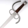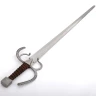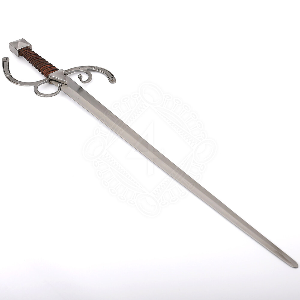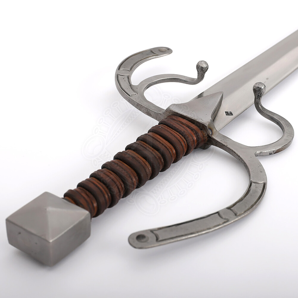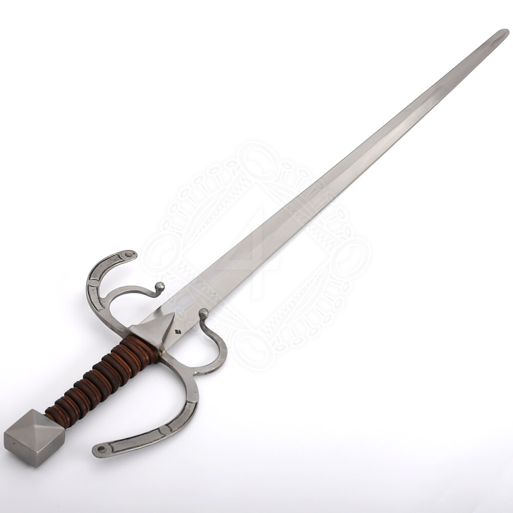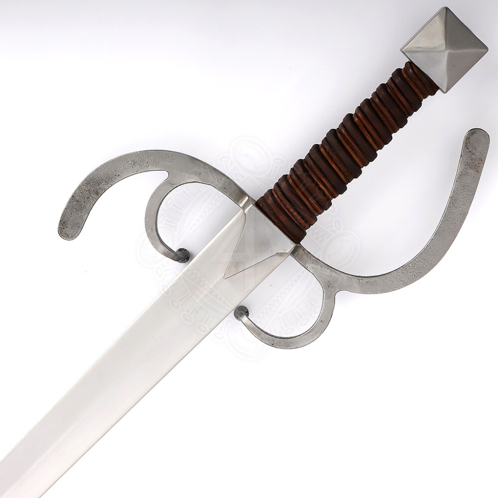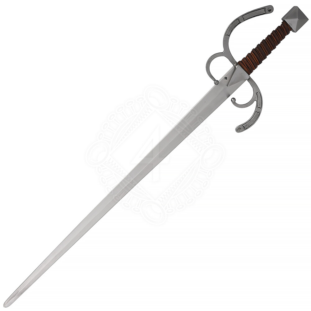Tento renesanční meč je datován do první poloviny 16. století. Používaný byl převážně v Itálii. Jedná se o vývojový typ zbraně mezi klasickým rytířským mečem s přímou záštitou a rapírem 16. století. Krátký jílec ukazuje, že šermíř prsty svíral také rikaso, kde je chránily dva záštitné oblouky. Čepel je zbroušena do oboustranného ostří bez žlábku. Záštita je tvořena dvěma záštitnými oblouky jemně zdobenými kovaným vrypem. Rukojeť je zdobně ovinuta dvěma vrstvami pravé hovězí kůže. Hlavice čtvercového tvaru je vykována do jehlanu na obou stranách. Tato zbraň je vhodná na historický a scénický šerm. Více informací k produktu ...