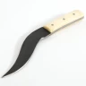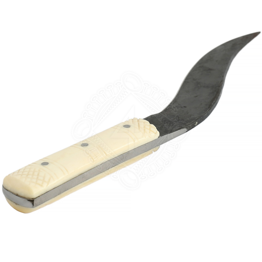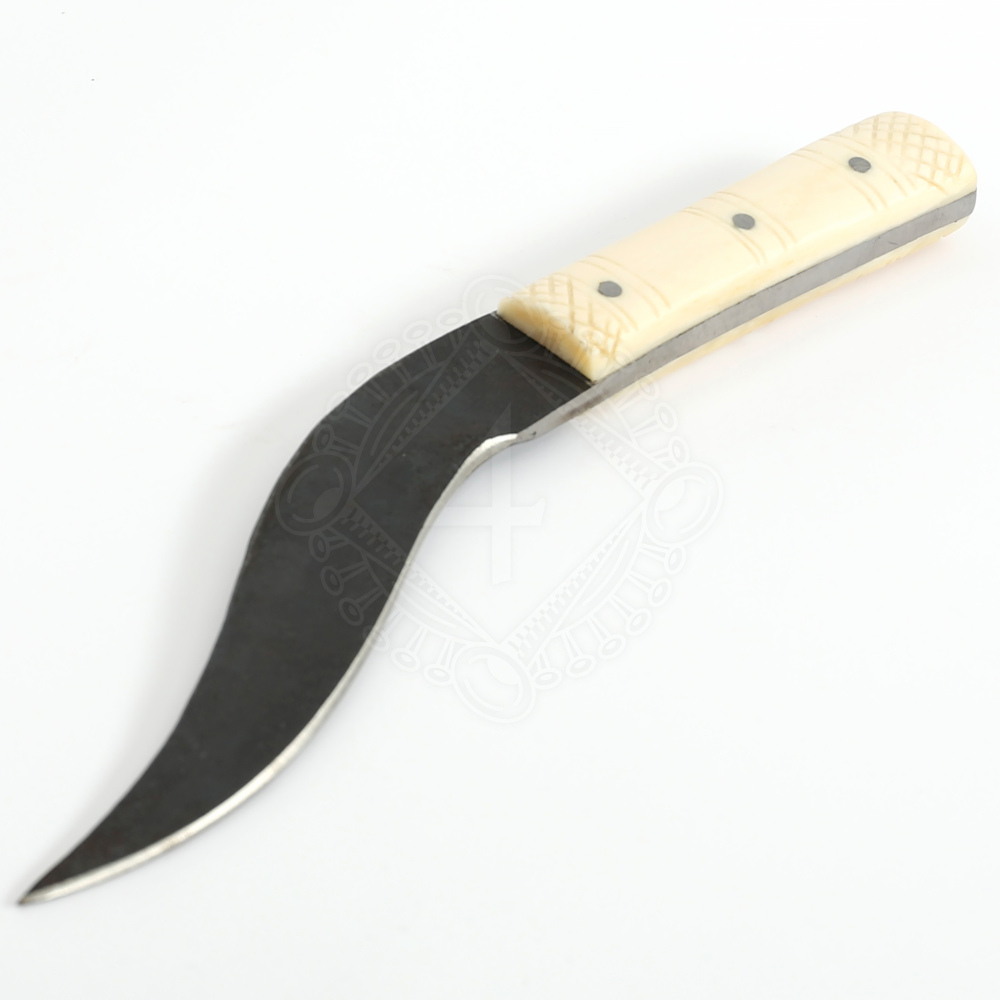 Ručně kovaný římský užitkový nůž se zdobenou kostěnou rukojetí. Čepel má typické zakřivení římských nožů. To umožňuje vynaložit větší úsilí při řezání, protože můžete také vyvíjet tlak ukazováčkem nebo palcem na tupý hřbet čepele. Více informací k produktu ...
