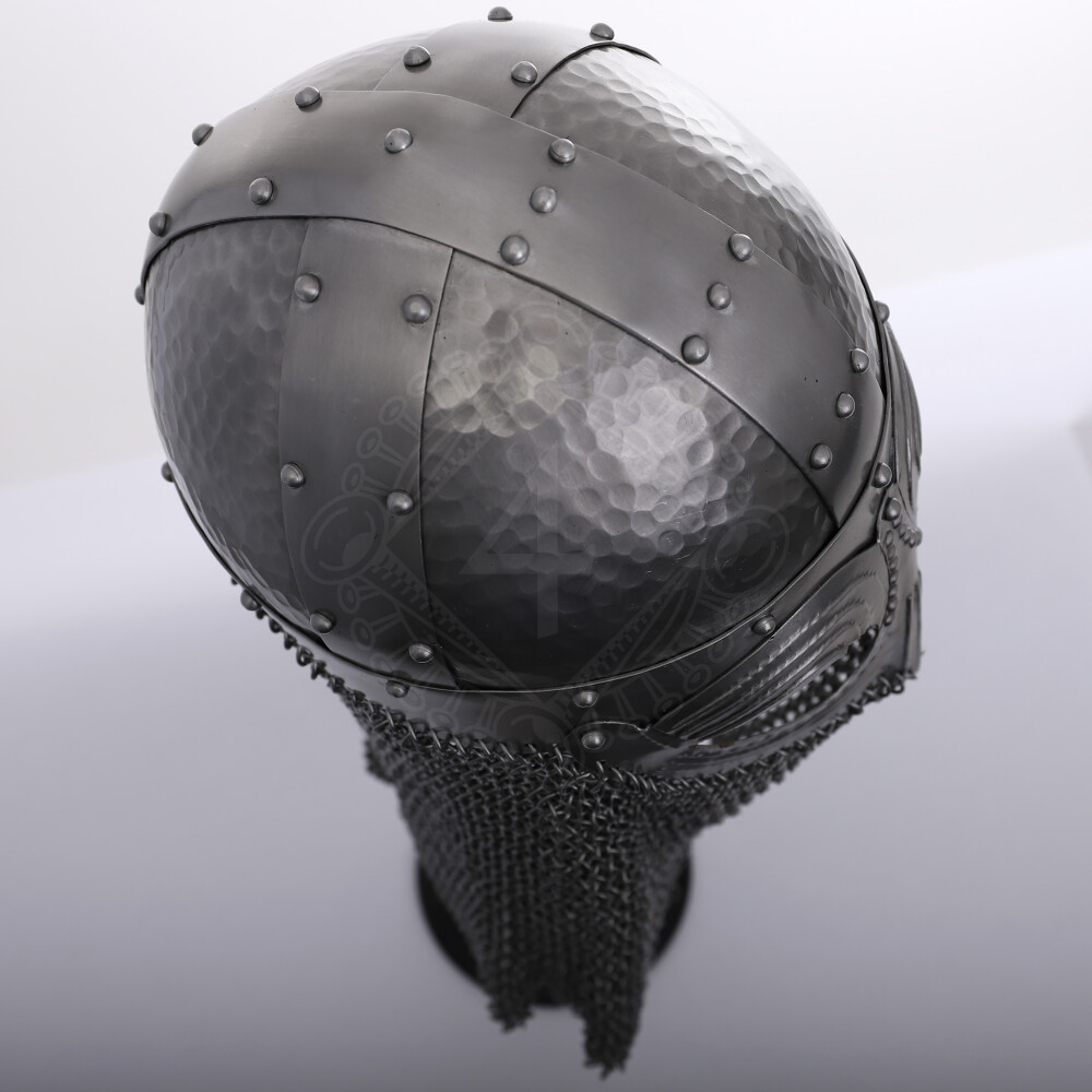 Přilba je ručně vyrobena z konstrukční oceli o síle cca 1,2 mm (18 gauge). Povrch má záměrně rustikální, tepanou úpravu („antique finish“), která přilbě dodává vzhled bojem zoceleného kusu zbroje, nikoliv naleštěné cetky z vitríny. Konstrukčně se jedná o žebrovou přilbu (spangenhelm), kde jsou ocelové pláty spojeny nýty a zpevněny kovovými pásky.