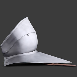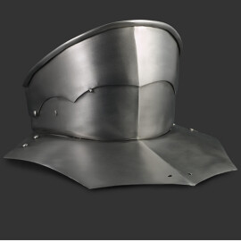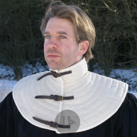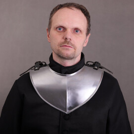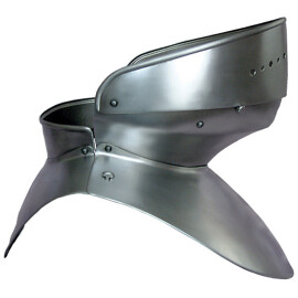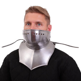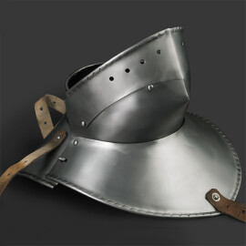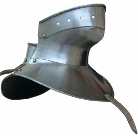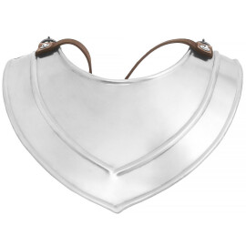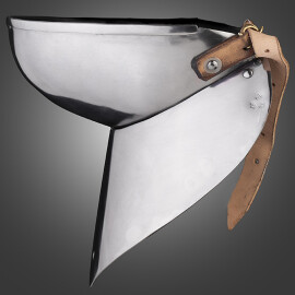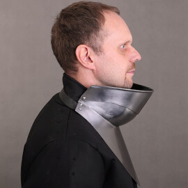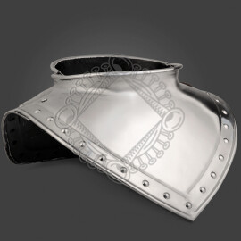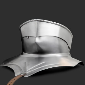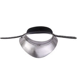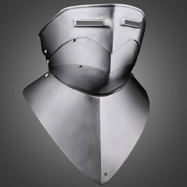 Tento nákrčník, inspirovaný zbrojemi z 14. a 15. století, je navržen s ohledem na funkčnost a pohodlí. Skládá se z předního a zadního plátu, které se spojují pomocí kožených řemínků s přezkami, takže si velikost snadno přizpůsobíš. Středový prolis (tzv. „hřeben“) nejenže skvěle vypadá, ale také zvyšuje pevnost celé konstrukce a pomáhá odklánět údery. Horní okraj je důmyslně srolovaný a zesílený, aby tě chránil před ostrými hranami a pohodlně seděl na krku i přes prošívanici.