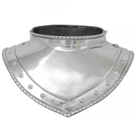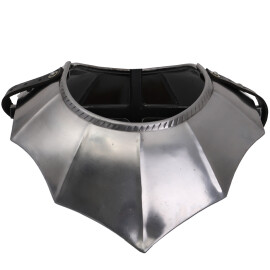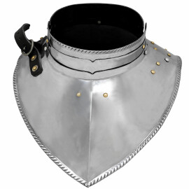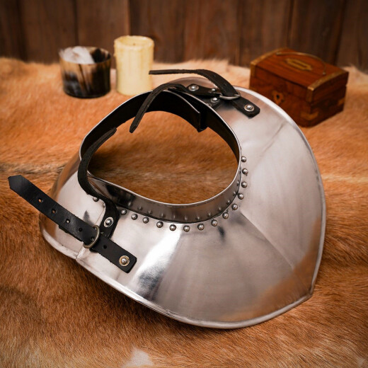Tento nákrčník je nepostradatelnou součástí každé plné plátové zbroje. Jeho primární funkcí je chránit zranitelnou oblast krku, klíčních kostí a horní části hrudi, kterou nepokrývá helma ani kyrys. V tomto konkrétním provedení slouží navíc jako nosný systém pro ramenní pláty, čímž zajišťuje, že celá tvoje zbroj tvoří jeden funkční a pohyblivý celek. Je to ideální volba pro postavu rytíře, zbrojnoše nebo žoldnéře pro LARP, reenactment nebo cosplay.