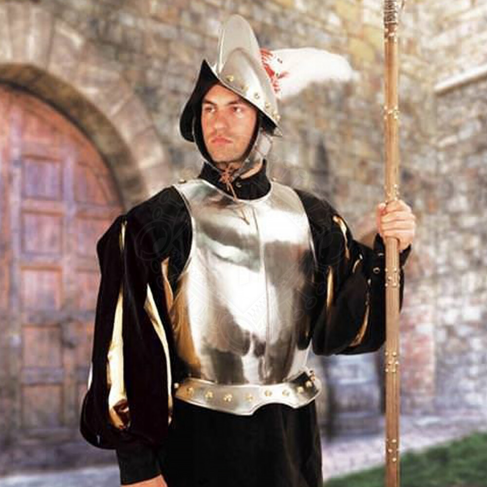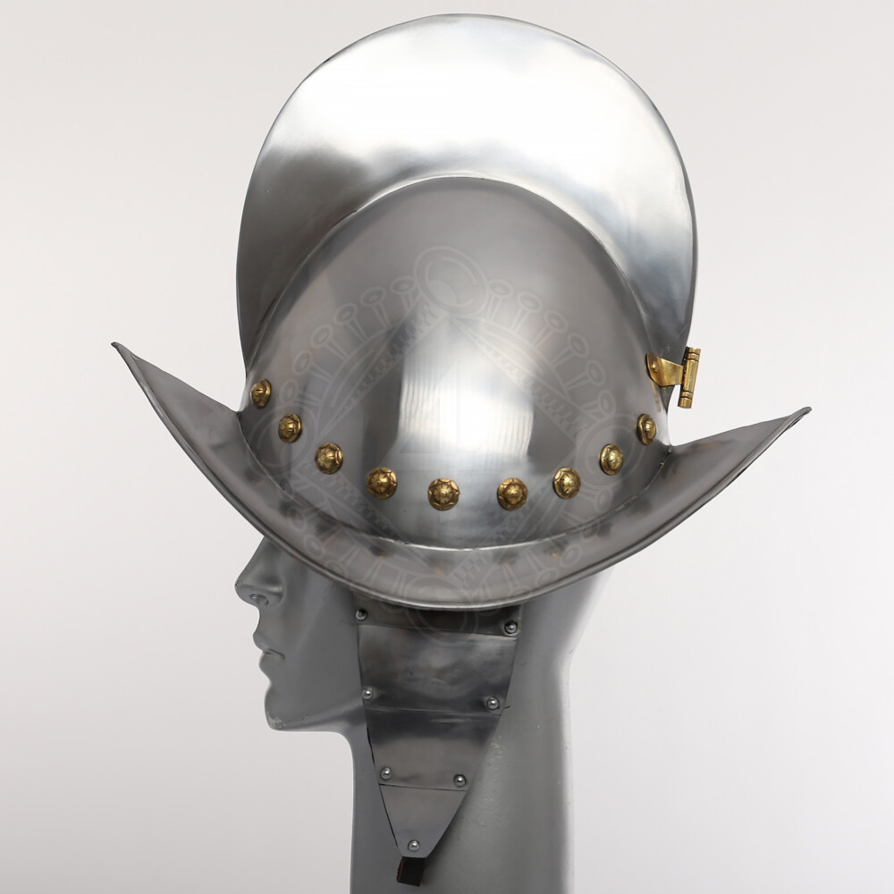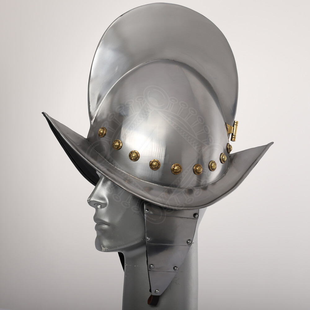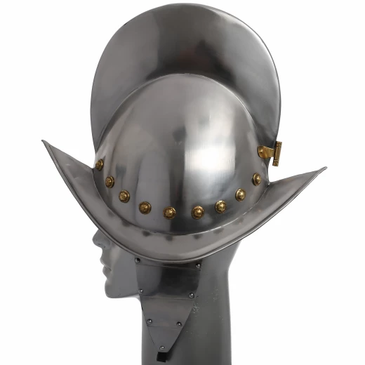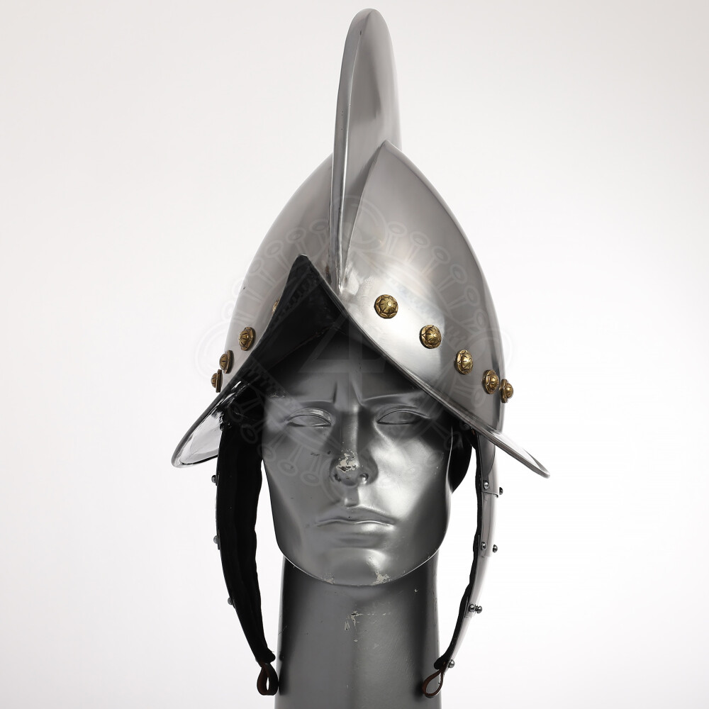 Tento typ otevřené přilby se používal od poloviny 16. do počátku 17. století. Tato kovová přilba je zdobena mosaznými nýty a je dodávána s ochranou tváří a uší a řemenem pod bradu, dutinkou na zdobná pera a nastavitelnou látkovou výstelkou. Více informací k produktu ...