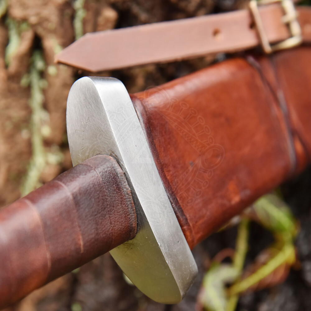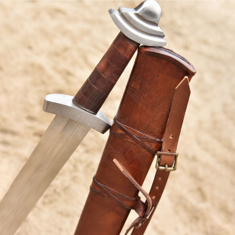 Meč je dodáván s velmi pěknou dřevěnou koženou pochvou se dvěma přezkami připevněnými k popruhům. Můžete si jí například připevnit na opasek.