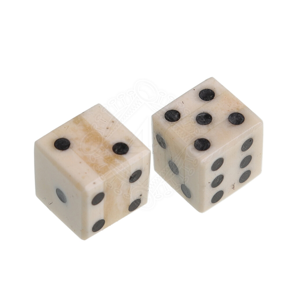 Dvě herní kostky z kosti s vykládanými tečkami