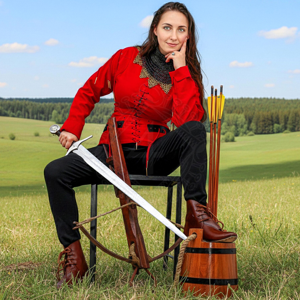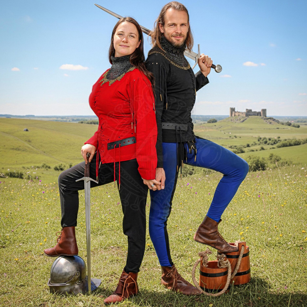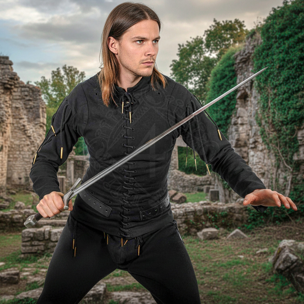 • Samostatné nošení: Díky elegantnímu vypasovanému střihu a stojacímu límci vypadá kabátec skvěle i jako civilní oděv pro táborový život nebo lehčí šermířské tréninky (upozorňujeme však, že bez zbroje neposkytuje významnou ochranu proti úderům).
