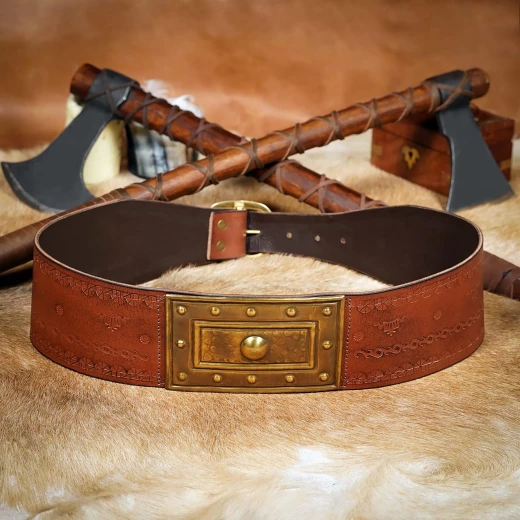 Připrav se na dobrodružství a staň se neohroženým válečníkem s tímto impozantním barbarským opaskem! Tento extra široký opasek z pravé buvolí kůže je navržen tak, aby dodal tvému kostýmu barbara, vikingského nájezdníka nebo fantasy bojovníka ten správný drsný vzhled. Jeho dominantou je velký, umělecky patinovaný mosazný plát vpředu, zatímco praktické zapínání je chytře skryto na zádech. Díky robustní konstrukci a detailnímu zdobení je tento opasek nejen ohromujícím doplňkem, ale i funkční součástí tvé výzbroje. Více informací k produktu ...