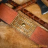 Zapínání je řešeno jednoduchou, ale pevnou mosaznou přezkou umístěnou na zádech, aby nic nerušilo epický vzhled přední části. To zajišťuje nejen čistý design, ale i pohodlné nastavení velikosti. Na vnitřní straně opasku, hned za mosazným plátem, se navíc nachází malá skrytá kožená kapsa, ideální pro uschování mincí nebo jiných drobných cenností.