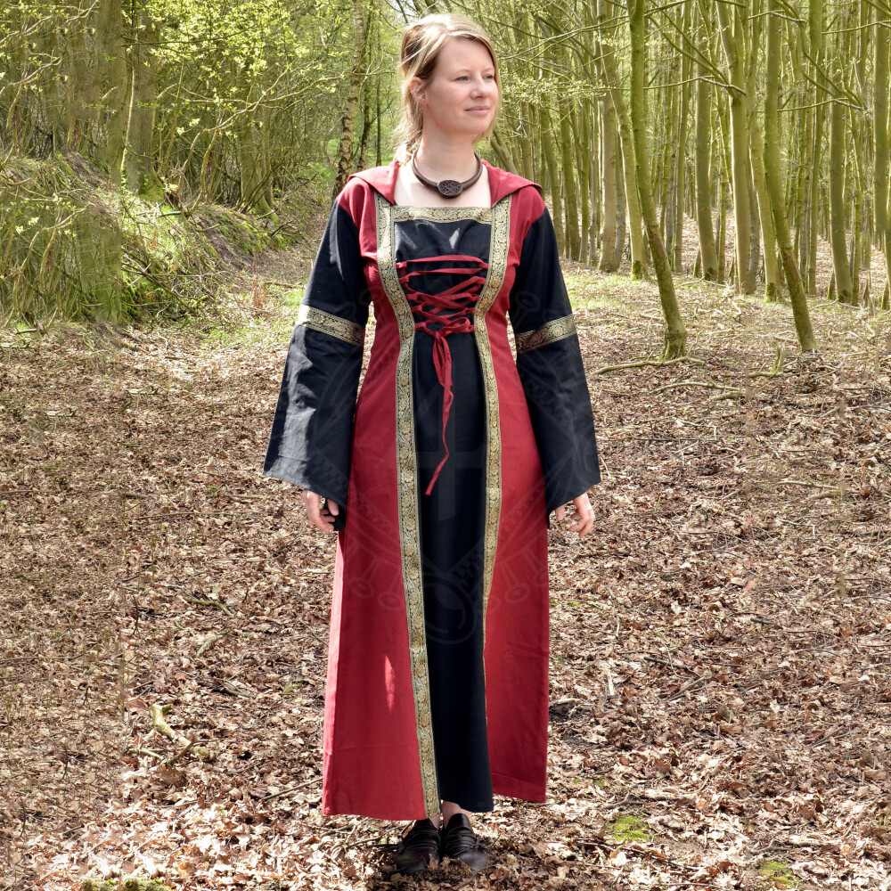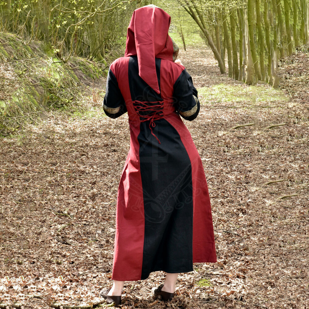 Krásné středověké šaty se špičatou kapucí. Šaty mají vpředu i vzadu šněrování, aby perfektně padly. Rukávy šatů jsou mírně rozšířené. Středověké roucho bylo navíc opatřeno krásným lemem. Barevná kombinace šatům dodává jedinečné kouzlo. Více informací k produktu ...