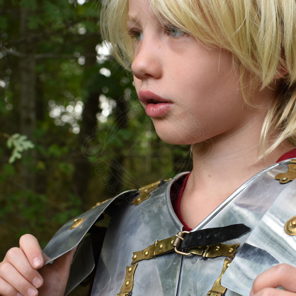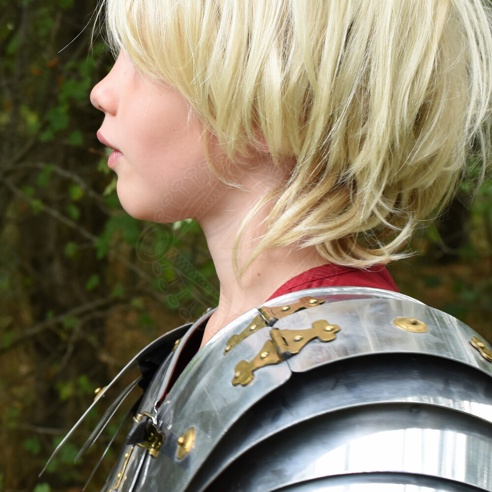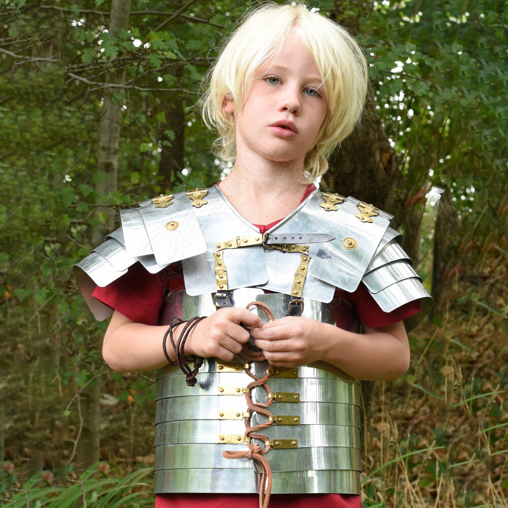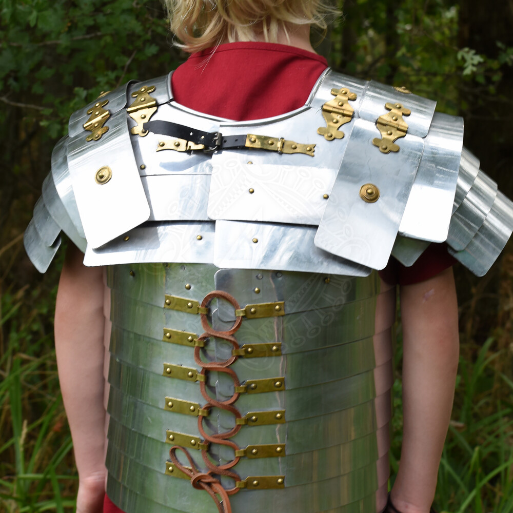 Toto dobře pohyblivé nastavitelné brnění pro malé legionáře je vyrobeno z hliníku, takže se nejen snadno přenáší, ale je také odolné proti korozi, trvanlivé a snadno se udržuje. Věrné originální panty, přezky a další ozdobné kování jsou vyrobeny z mosazi. Zapínací pásky a přední a zadní šněrování jsou kožené.