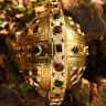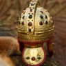 Tato replika věrně napodobuje tvar a zdobení pozdně římských přileb, konkrétně slavného nálezu Berkasovo. Zlatavá mosazná konstrukce je osázena četnými skleněnými kameny různých barev (převážně červené, zelené a tmavé odstíny připomínající onyx či safír) a tvarů (kulaté, obdélníkové, kosočtvercové), které imitují drahokamy originálního artefaktu. Povrch helmy je dále členěn tepanými geometrickými a florálními motivy, tečkováním a linkami, které podtrhují její luxusní a detailní charakter. Výrazným prvkem je centrální hřeben, táhnoucí se od čela k zátylku, rovněž bohatě zdobený vsazenými kameny. Nad čelem se klene zdobený oblouk, který přechází v prolamovanou strukturu připomínající diadém, dodávající přilbě na vznešenosti. Přilba disponuje pohyblivými lícnicemi a pevným chráničem krku; obojí je pro tvé pohodlí z vnitřní strany polstrováno a potaženo kvalitní červenou kůží. Vnitřek helmy je vybaven prošívanou vložkou také z červené kůže, doplněnou řemínky pro individuální přizpůsobení velikosti a stabilní usazení na hlavě.