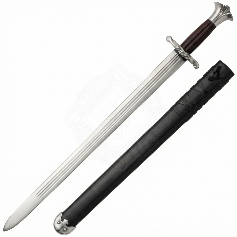 Součástí dodávky je černá kožená pochva se zdobným křížovým oplétáním a unikátní ocelovou nákončím, které chrání špičku meče a zároveň dotváří jeho historický vzhled.