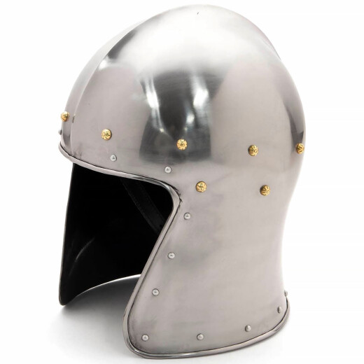 Příklad jedné z nejelegantnějších přileb historie vychází z originálu barbuty z 15. století ze severní Itálie. Podobná barbuta je součástí sbírky Metropolitního muzea v New Yorku. Ozdobné mosazné nýty obepínají zvon helmy na úrovni čela a ocelové nýty lemují okraje. Nízký hřeben zvyšuje mechanickou odolnost helmy. Více informací k produktu ...
