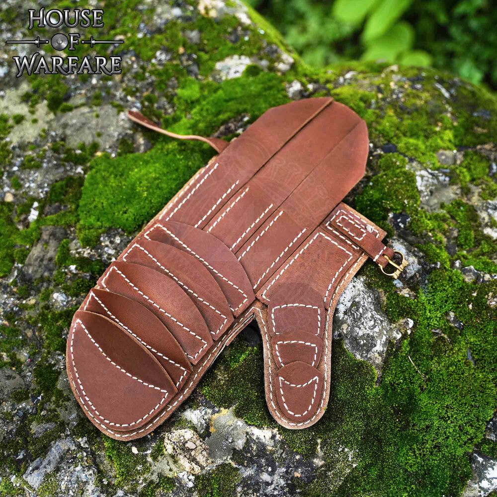 Ochraň svou rukavici v bitevní vřavě s touto robustní koženou rukavicí typu palčák, navrženou speciálně pro pravou ruku. Je vyrobena z kvalitní hnědé hovězí kůže a její konstrukce poskytuje skvělou rovnováhu mezi ochranou a flexibilitou. Hřbet ruky a prsty jsou kryty několika vrstvami překrývajících se kožených segmentů, které efektivně tlumí nárazy, zatímco palec má vlastní, podobně kloubovou ochranu. Otevřená dlaň a vnitřní popruhy zajišťují, že ti zbraň nevyklouzne a budeš mít vždy pevný a jistý úchop. Tato rukavice je ideální volbou pro re-enactment, LARP, divadelní šerm nebo jako doplněk k historickému kostýmu. Více informací k produktu ...
