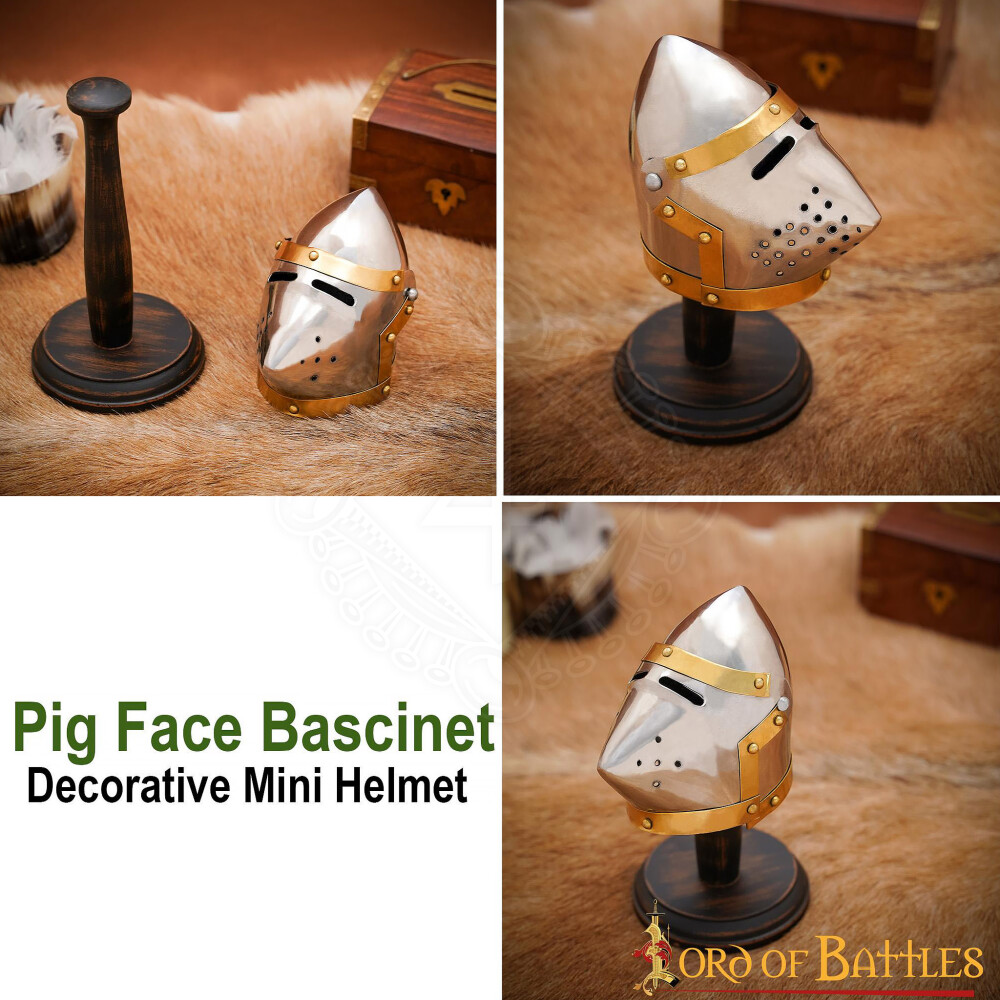 Přilba okamžitě zaujme svým ikonickým tvarem. Kónická kalota plynule přechází v ostře protažený hledí, které připomíná čenich a dalo helmě její charakteristické jméno. Stříbrný, zrcadlově lesklý povrch je elegantně doplněn lemováním z leštěné mosazi. Drobné, pečlivě rozmístěné dýchací otvory na hledí podtrhují historickou autentičnost. Celá miniatura je usazena na stabilním podstavci z tmavě mořeného dřeva, který vytváří dokonalý kontrast a nechává vyniknout řemeslnému zpracování.
