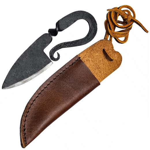 Tento malý, ale neuvěřitelně praktický nůž je ztělesněním středověkého řemesla a každodenní užitečnosti. Je ručně vykován z jednoho kusu oceli, což mu dává mimořádnou pevnost a autentický charakter. Díky svému designu se zkroucenou rukojetí a koženému pouzdru se šňůrkou je ideální jako nůž na krk – spolehlivý nástroj, který můžeš mít neustále u sebe, ať už jsi na historické akci, v lese, nebo jen připravuješ stylovou hostinu. Více informací k produktu ...