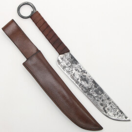 Na první pohled zaujme jeho surová, a přesto elegantní estetika. Tmavý, okujemi pokrytý povrch s viditelnými stopami po kovářském kladivu je důkazem poctivé ruční práce. Rukojeť je mistrně zkroucená a zakončená ozdobnou spirálou, přičemž její tvar nejen skvěle vypadá, ale také poskytuje překvapivě pohodlný a jistý úchop. Široká čepel je ideální pro řezání i krájení. K noži patří i jednoduché, ale robustní pouzdro z pravé hnědé kůže, které čepel bezpečně chrání a umožňuje pohodlné nošení na krku.