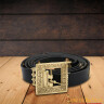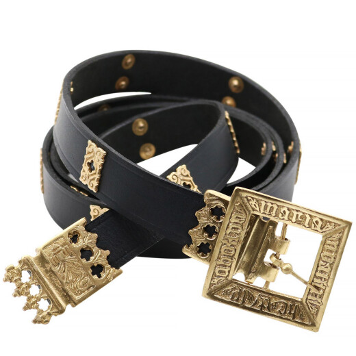Tento opasek není pouhým doplňkem, ale skutečným symbolem moci a autenticity. Je to výrazný prvek, který na první pohled odliší šlechtice od prostého lidu. Skládá se z pevného koženého řemene v černé barvě, na kterém jsou přinýtovány mosazné komponenty. Dominantou je čtvercová přezka s trnem a gotickým nápisem po obvodu. Řemen je dále rytmicky osazen obdélníkovými ozdobnými štítky s prořezávaným motivem čtyřlístku a mezi nimi menšími kulatými nýty. Opasek je zakončen zdobným mosazným nákončím, které opakuje motiv čtyřlístku a je završeno stylizovanou korunkou.