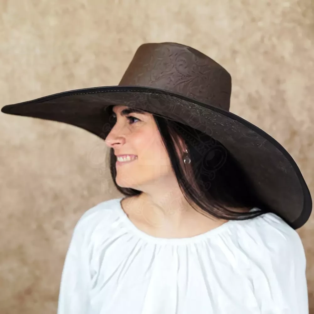 - Prémiová kůže s ražbou: Celý klobouk je vyroben z kvalitní kůže o tloušťce cca 1,5–1,8 mm, která je po celé ploše zdobena detailní květinovou ražbou.