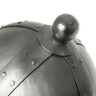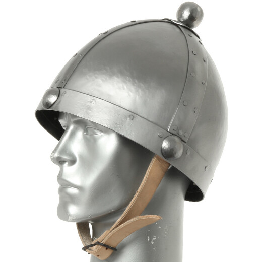 Tato verze této Oválné sponkové přilby podle Stuttgartského žaltáře je ručně bouchaná ze železného plechu. Obruba zvonu přilby je na čtyřech místech osazena malými pukličkami. Temeno hlavy zdobí ručně ukovaná železná koule. Jednotlivé části jsou k sobě pevně přinýtované. Více informací k produktu ...